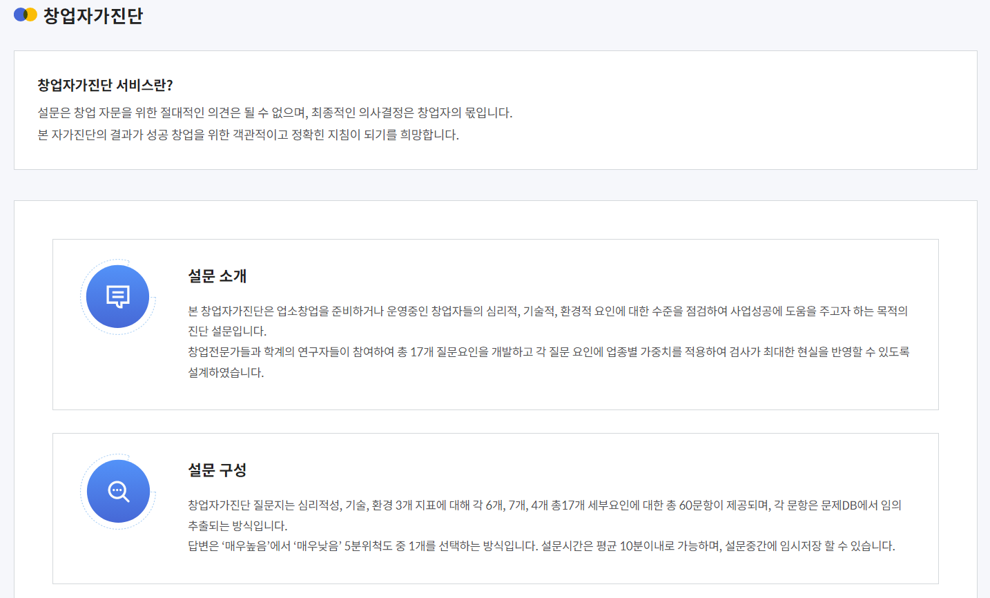 -창업 자가 진단 서비스와 이와 연계된 지원 사이트를 제공